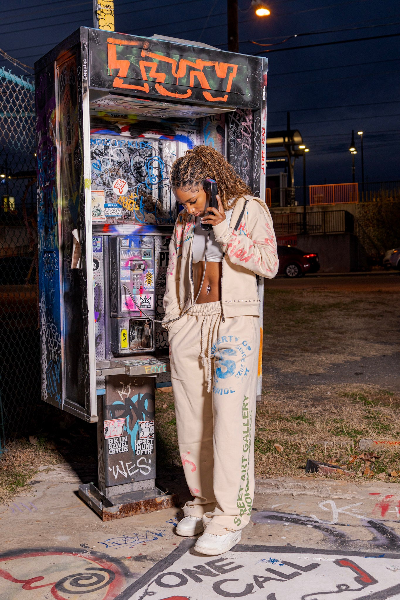 Details: Distressed hems, rope drawstrings, oversized screen-printed graphics